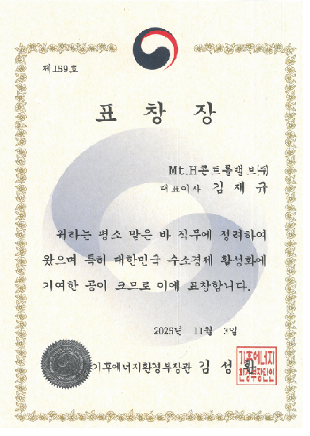 기후에너지환경부장관 표창 페이지 정보 작성일 25-11-04 12:56 목록 본문 Mt.H콘트롤밸브(주) 는 수소경제 활성화에 기여한 공로를 인정받아 기후에너지환경부 장관 표창을 수상하였습니다. 이전글한국가스공사 협력사 ESG 현장실사 "최우수" 등급 획득 25.11.04 다음글중국 공장(다롄) 개업식 영상 25.10.21